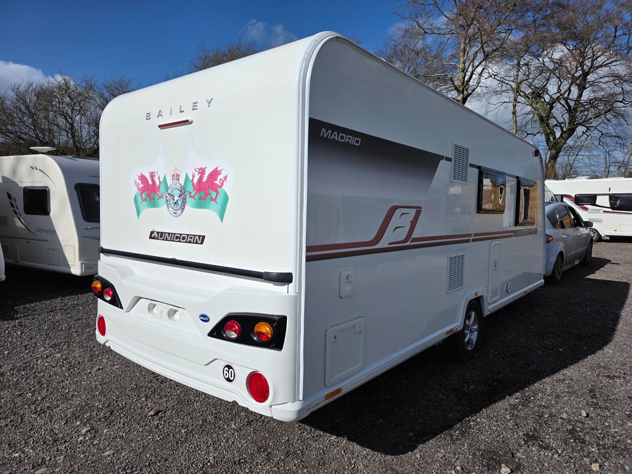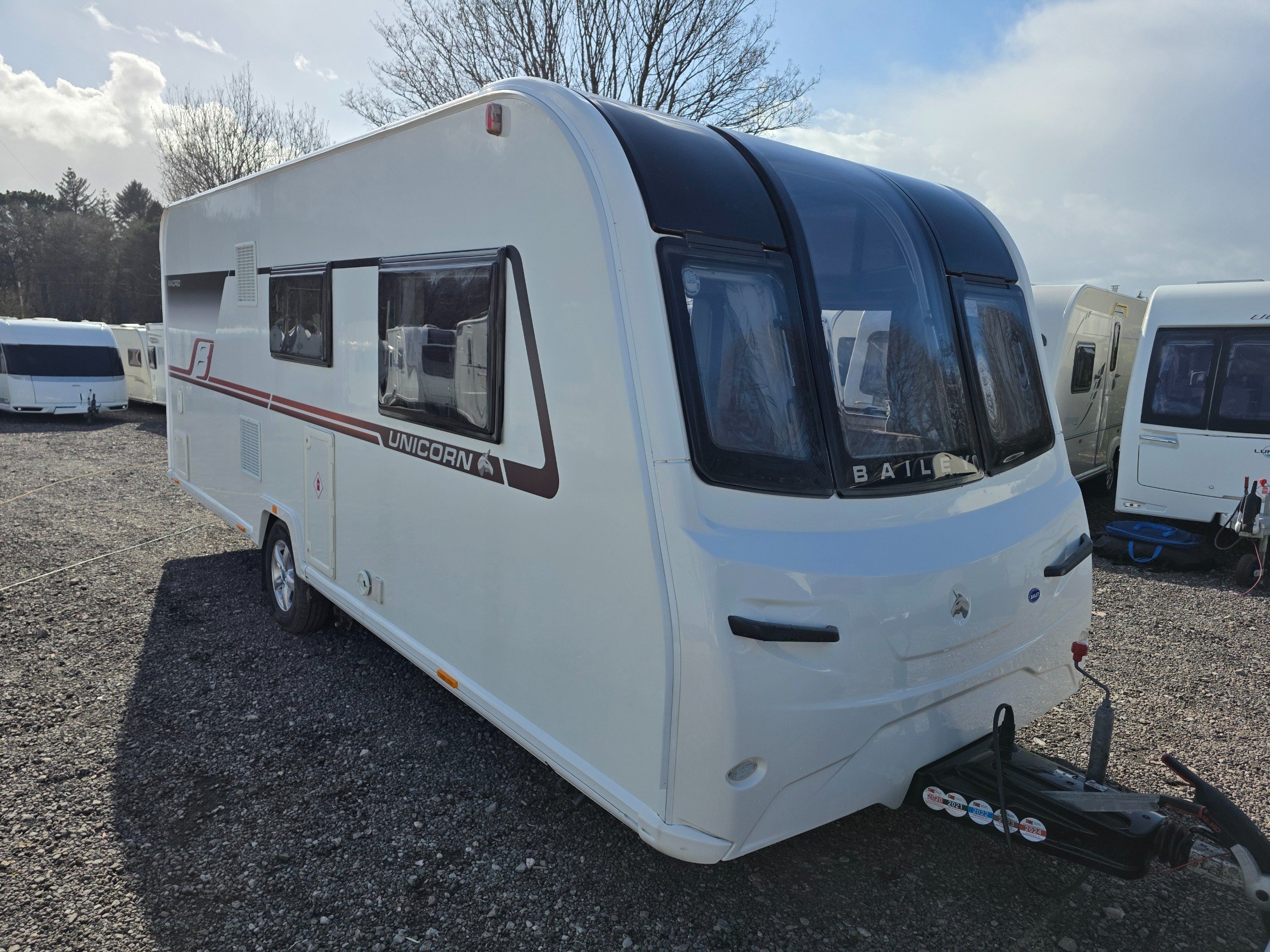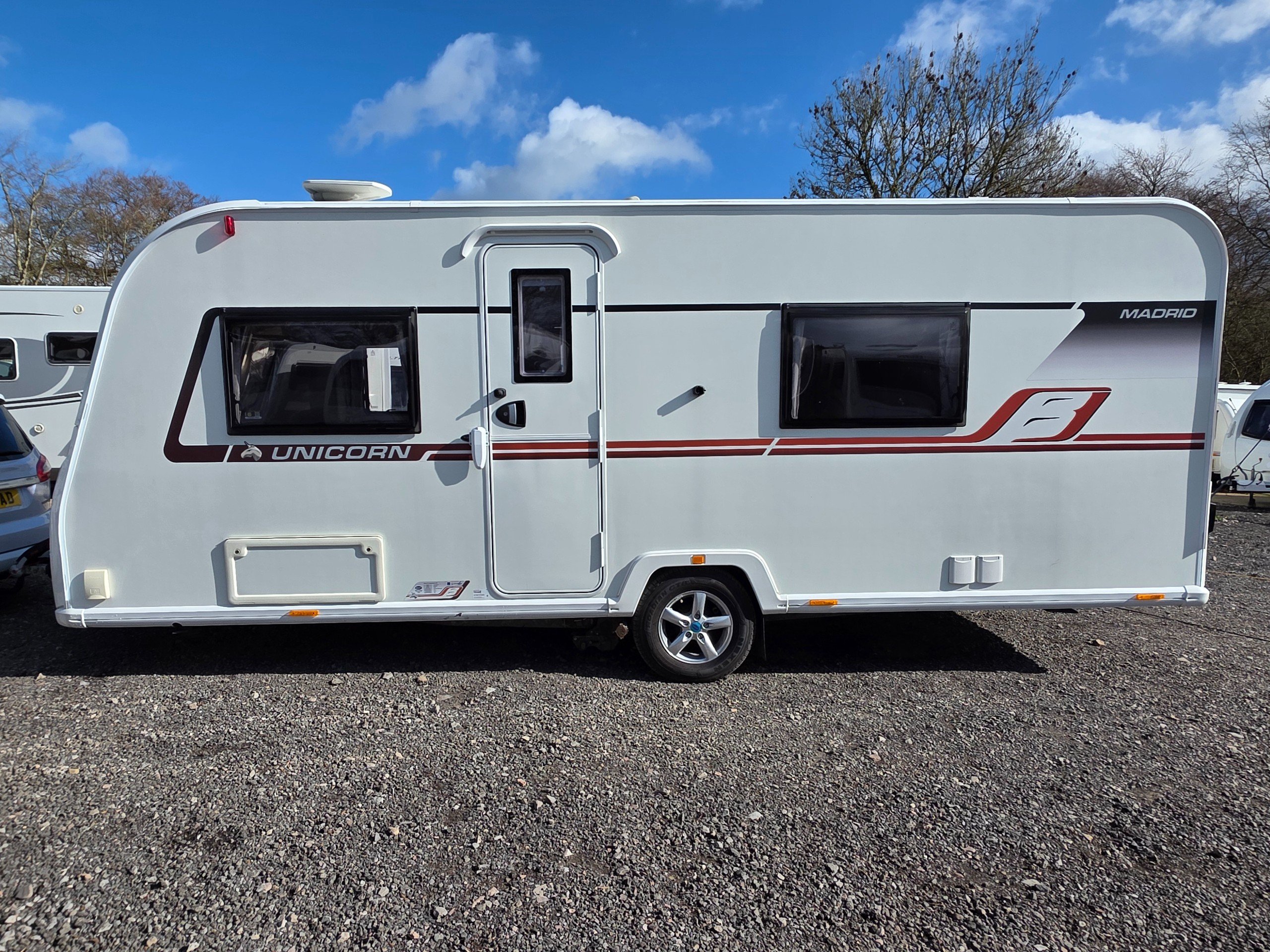 Bailey Unicorn Madrid, 3 berth 2019 caravan, in stunning Condition inside and out. This caravan is fully ready to take camping, it has lots of features and extras what you would expect from a high spec caravan such as this. It includes: hot and cold water, full central heating, full screens and blinds, full oven and grill, three-way fridge/freezer, 240–12 V electricity, HEKI rooflight, Alko Antisway towbar and much more.This caravan comes with a full