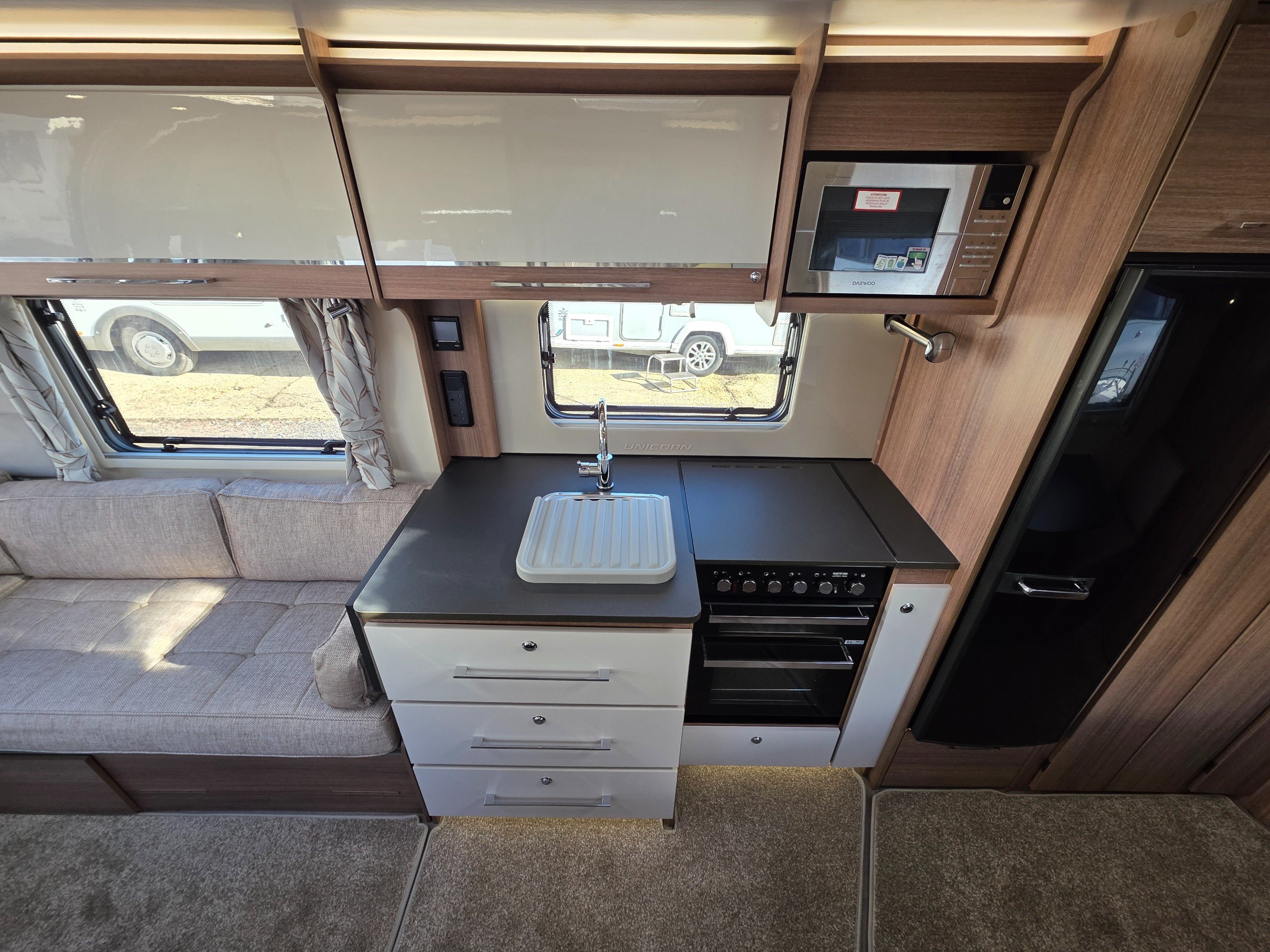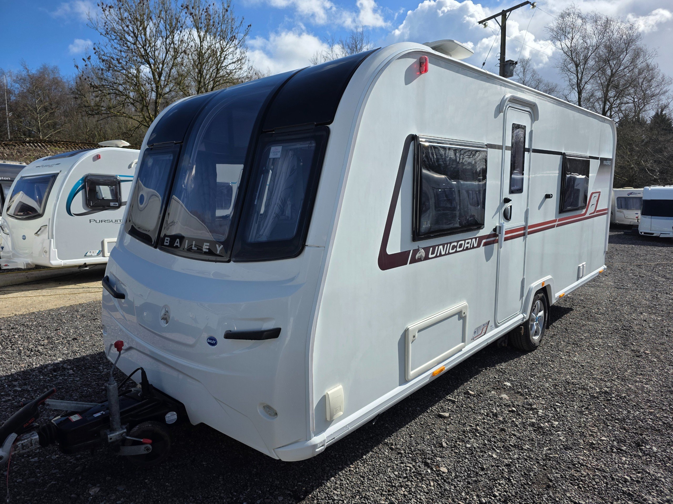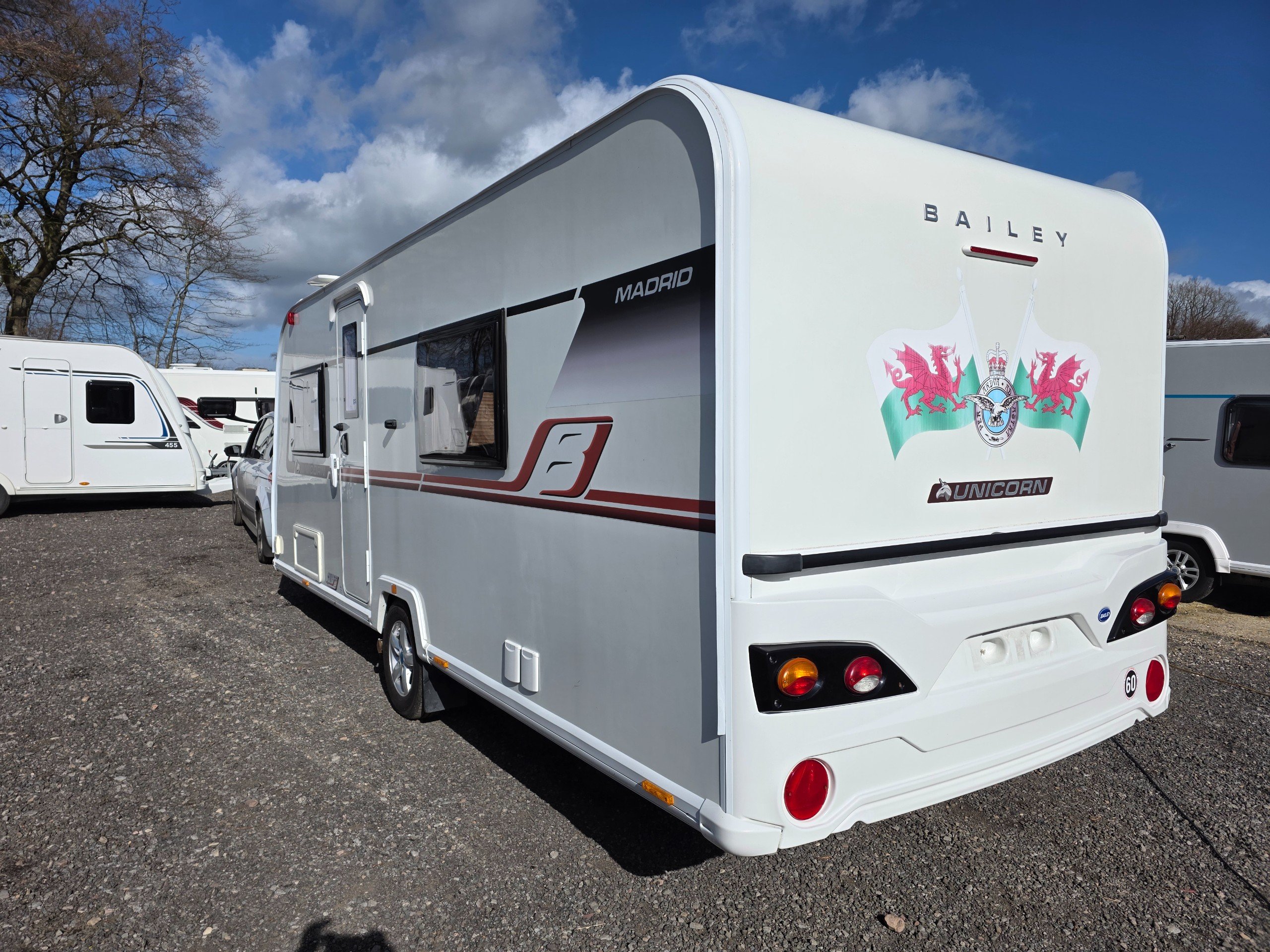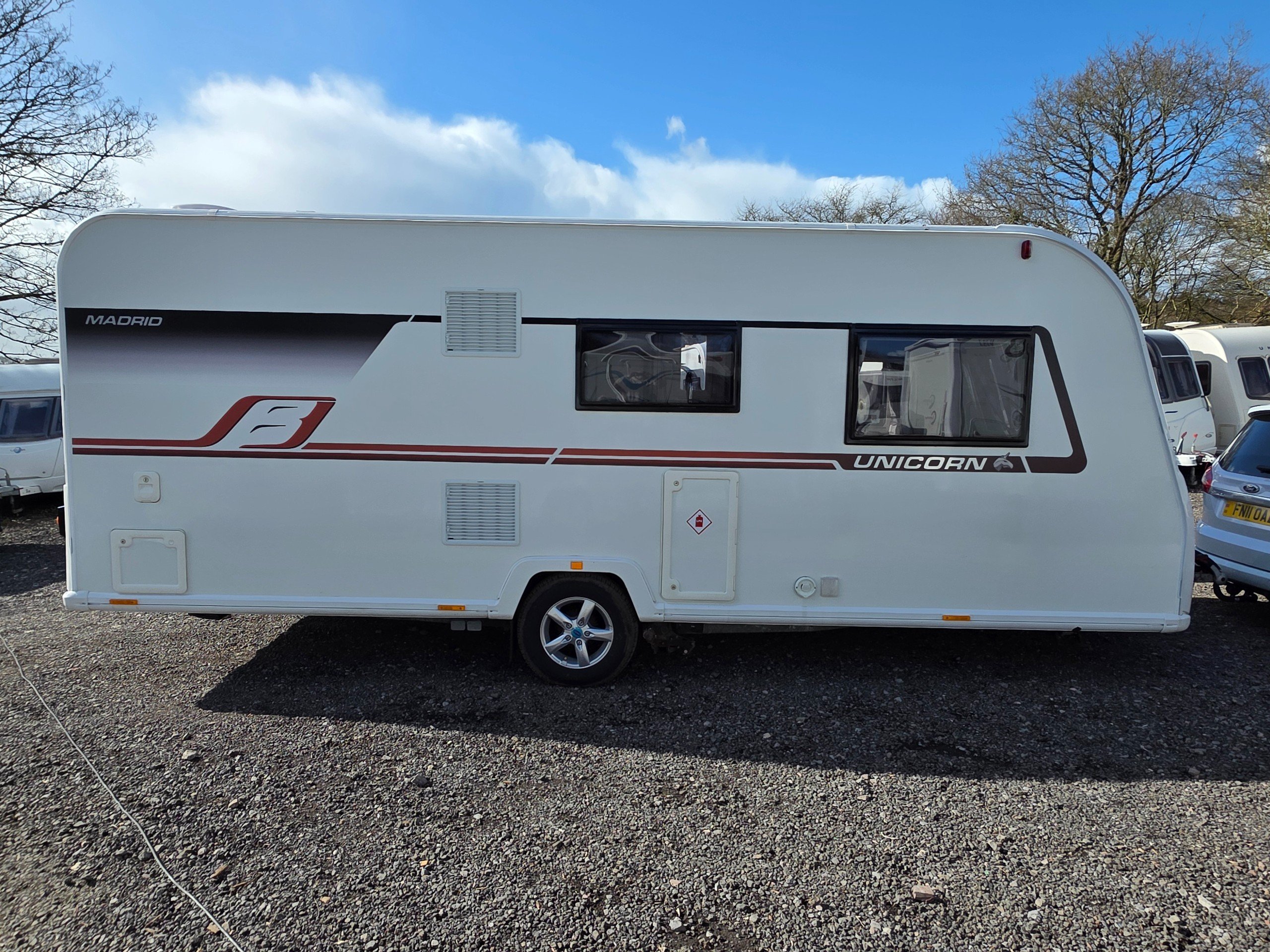 Bailey Unicorn Madrid, 3 berth 2019 caravan, in stunning Condition inside and out. This caravan is fully ready to take camping, it has lots of features and extras what you would expect from a high spec caravan such as this. It includes: hot and cold water, full central heating, full screens and blinds, full oven and grill, three-way fridge/freezer, 240–12 V electricity, HEKI rooflight, Alko Antisway towbar and much more.This caravan comes with a full