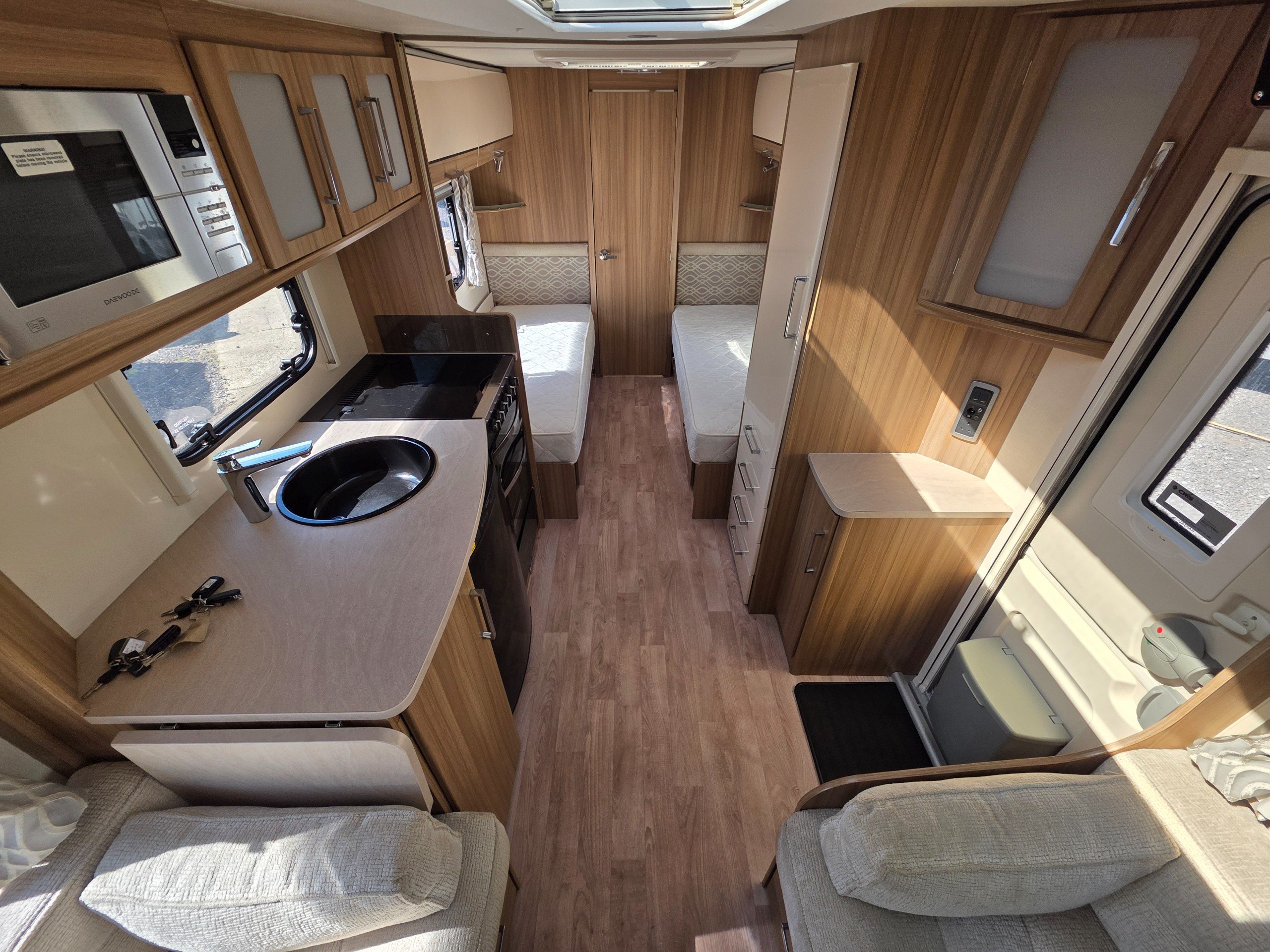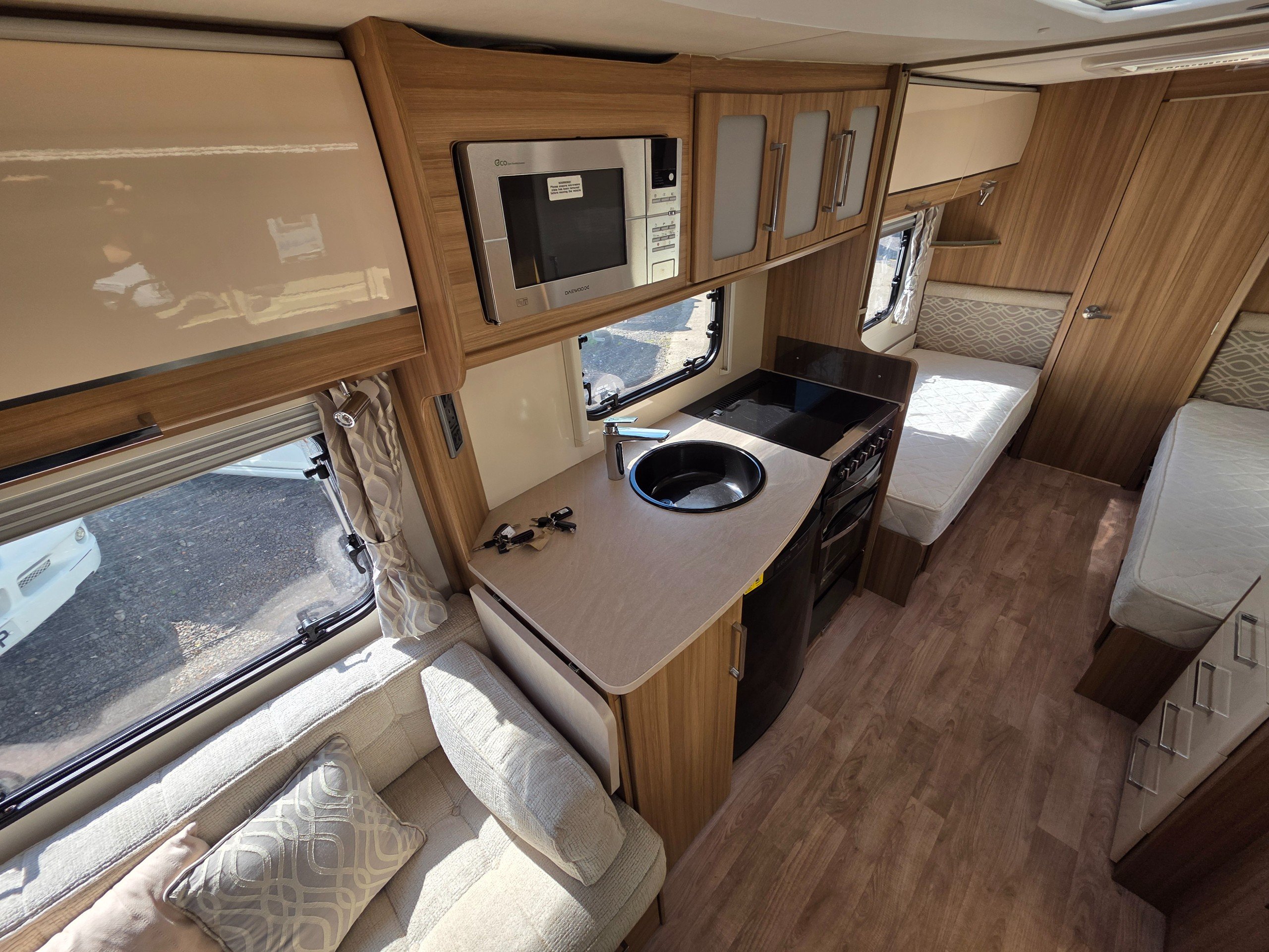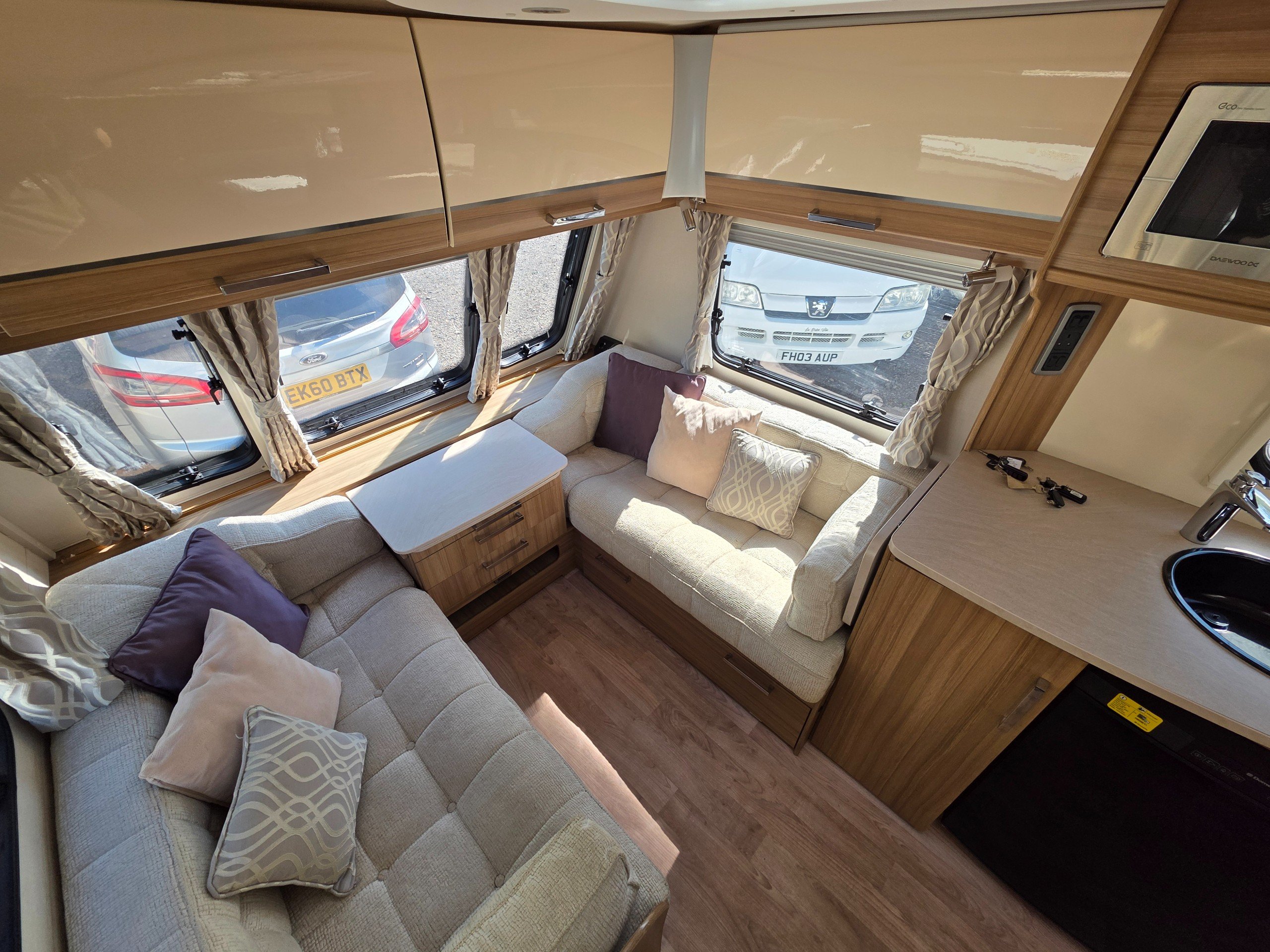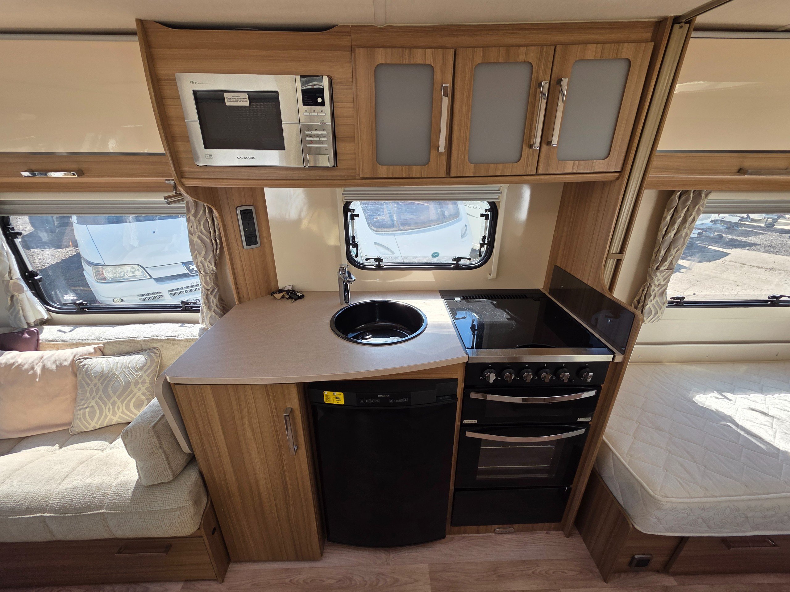 Lunar Clubman SB 2 berth 2015 caravan, in superb condition inside and out. This caravan is fully ready to take camping, it has lots of features and extras what you would expect from a high spec caravan such as this. It includes: hot and cold water, full central heating, full screens and blinds, full oven and grill, three-way fridge/freezer, 240–12 V electricity, HEKI rooflight, Alko Antisway towbar and much more.This caravan comes with a full