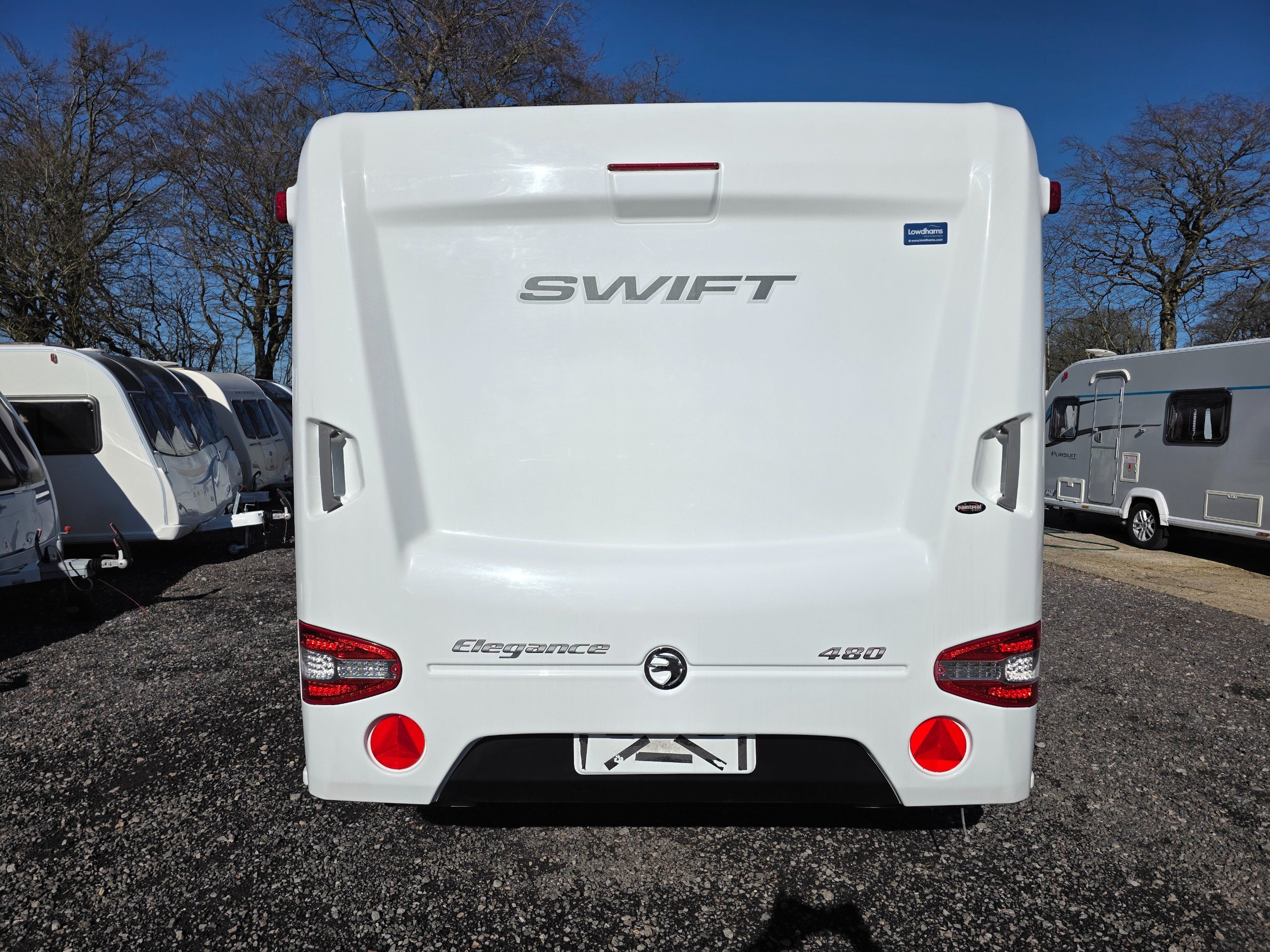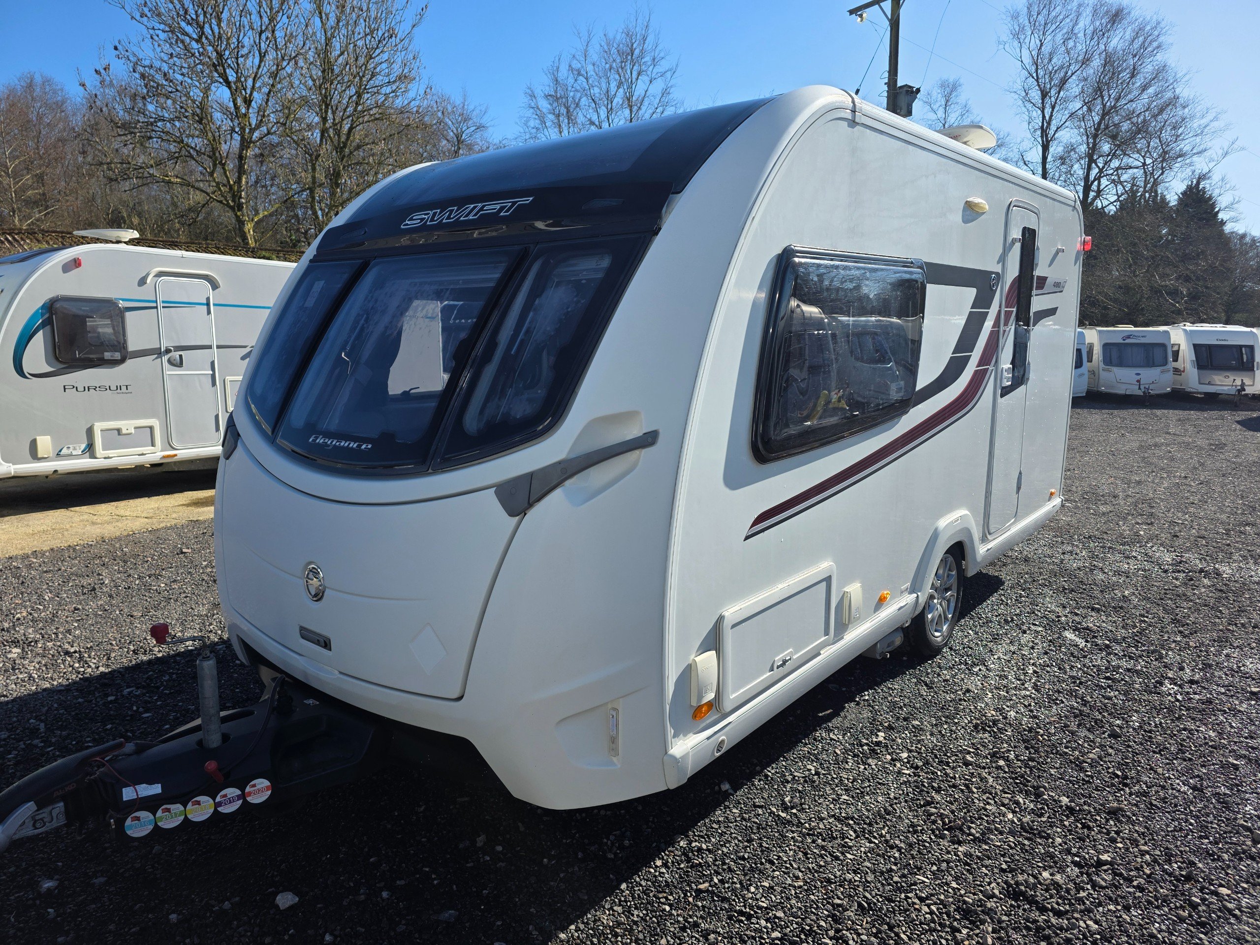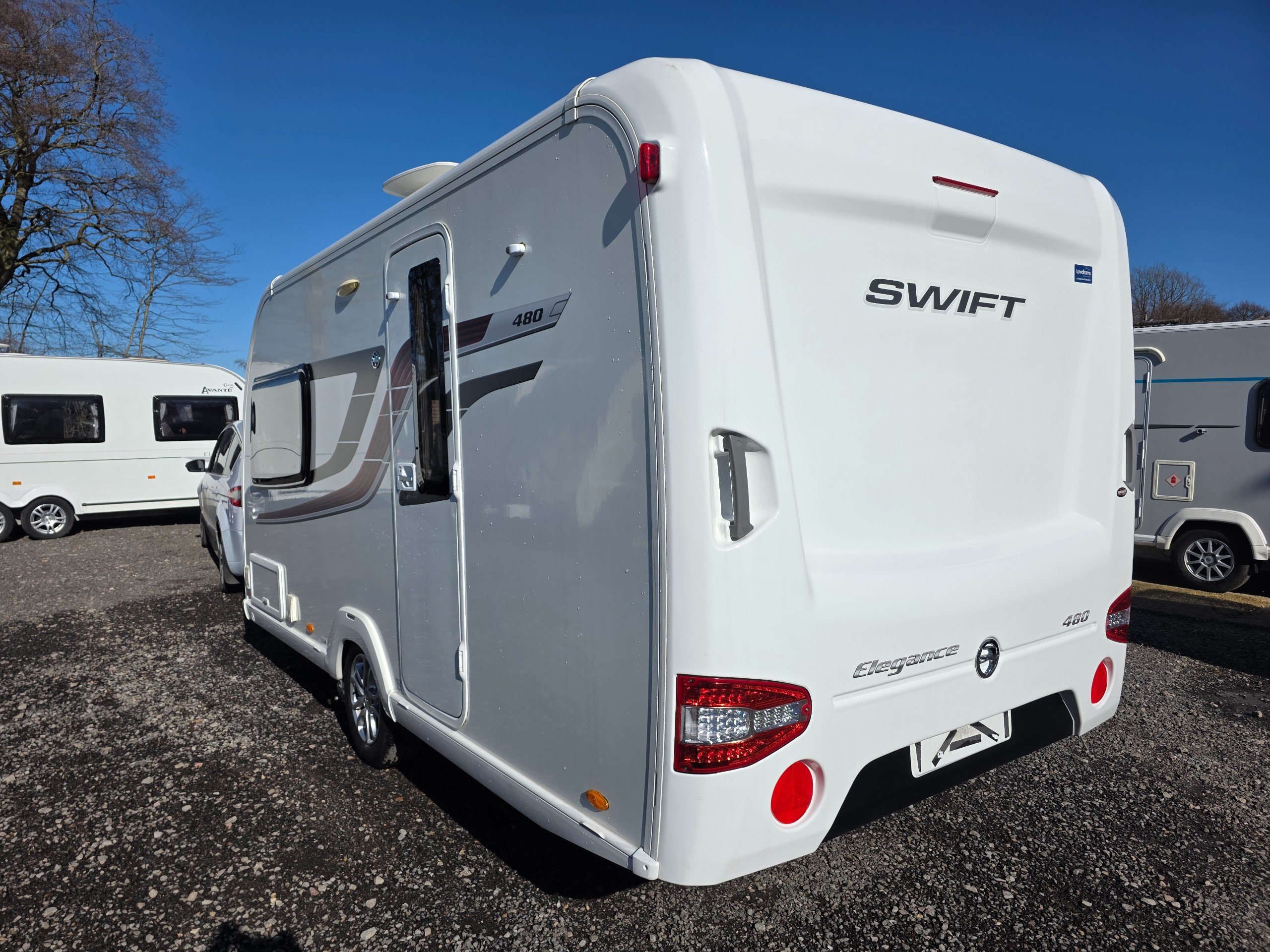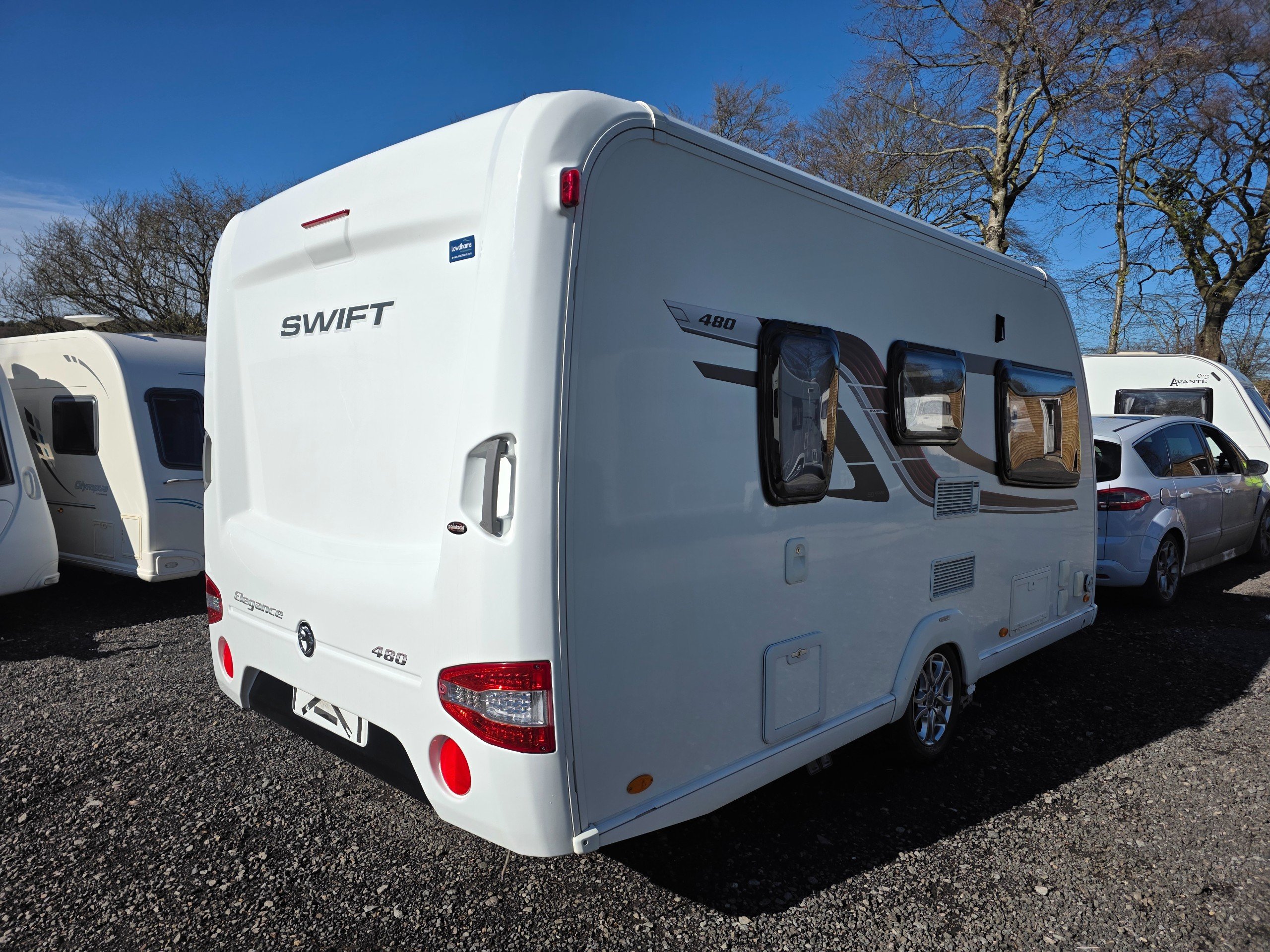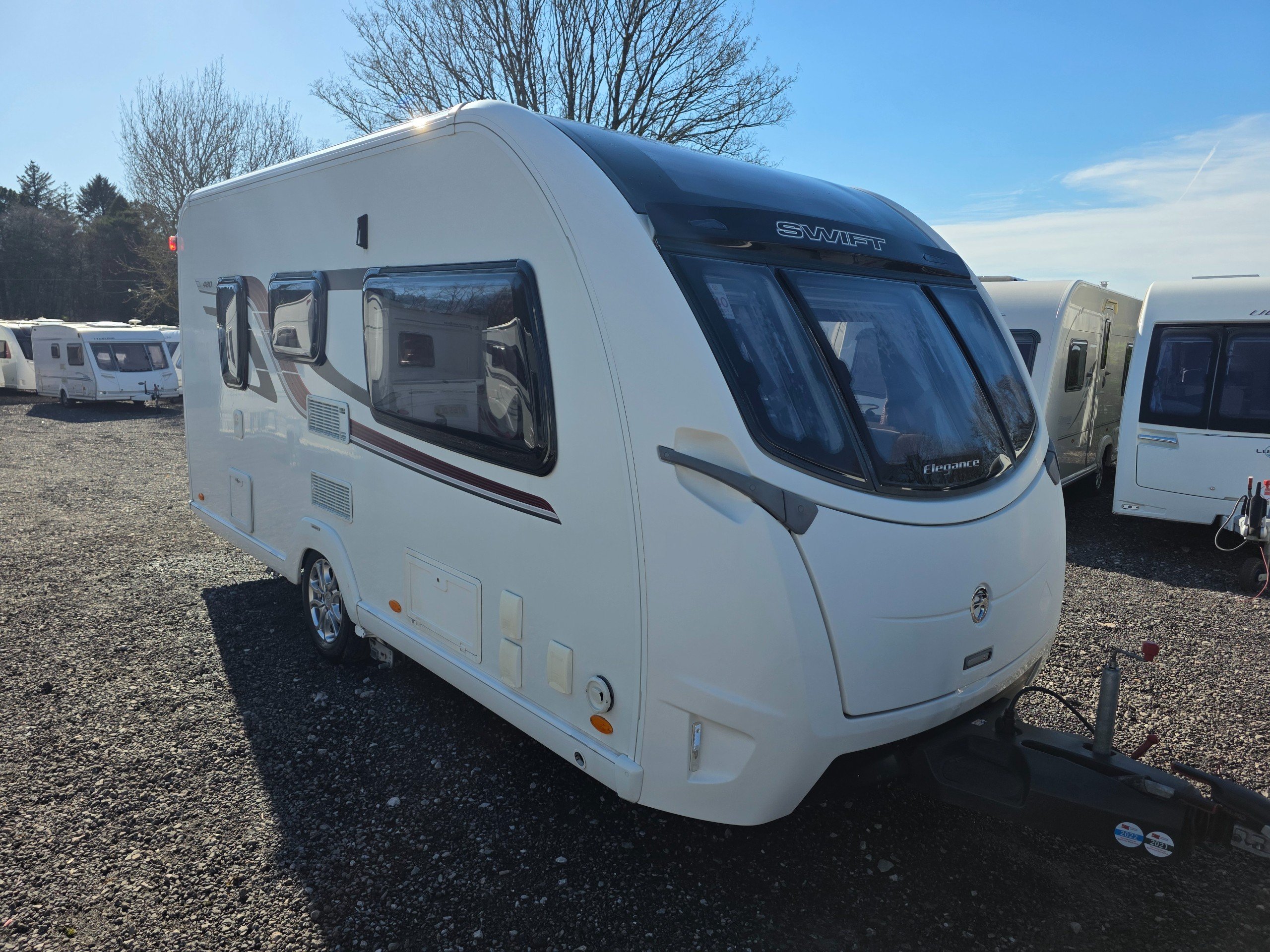 Swift Elegance 480, 50th Anniversary Edition, 2 berth 2014 caravan, in stunning condition inside and out. This caravan is fully ready to take camping, it has lots of features and extras what you would expect from a high spec caravan such as this. It includes: hot and cold water, full central heating, full screens and blinds, full oven and grill, three-way fridge/freezer, 240–12 V electricity, HEKI rooflight, Alko Antisway towbar and much more.This caravan comes with a full