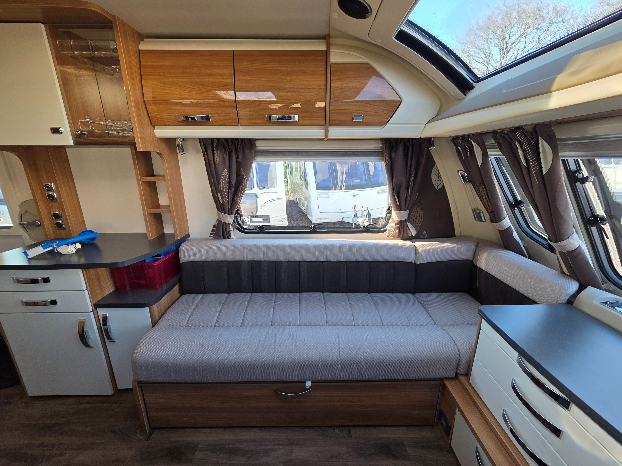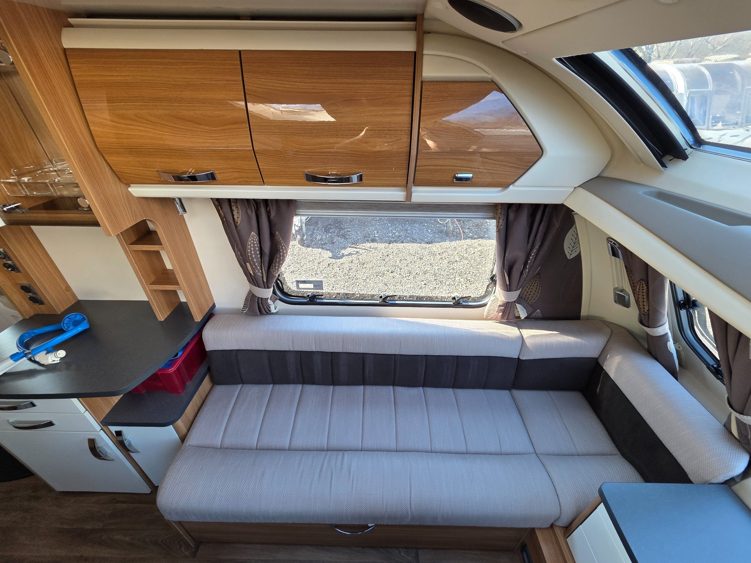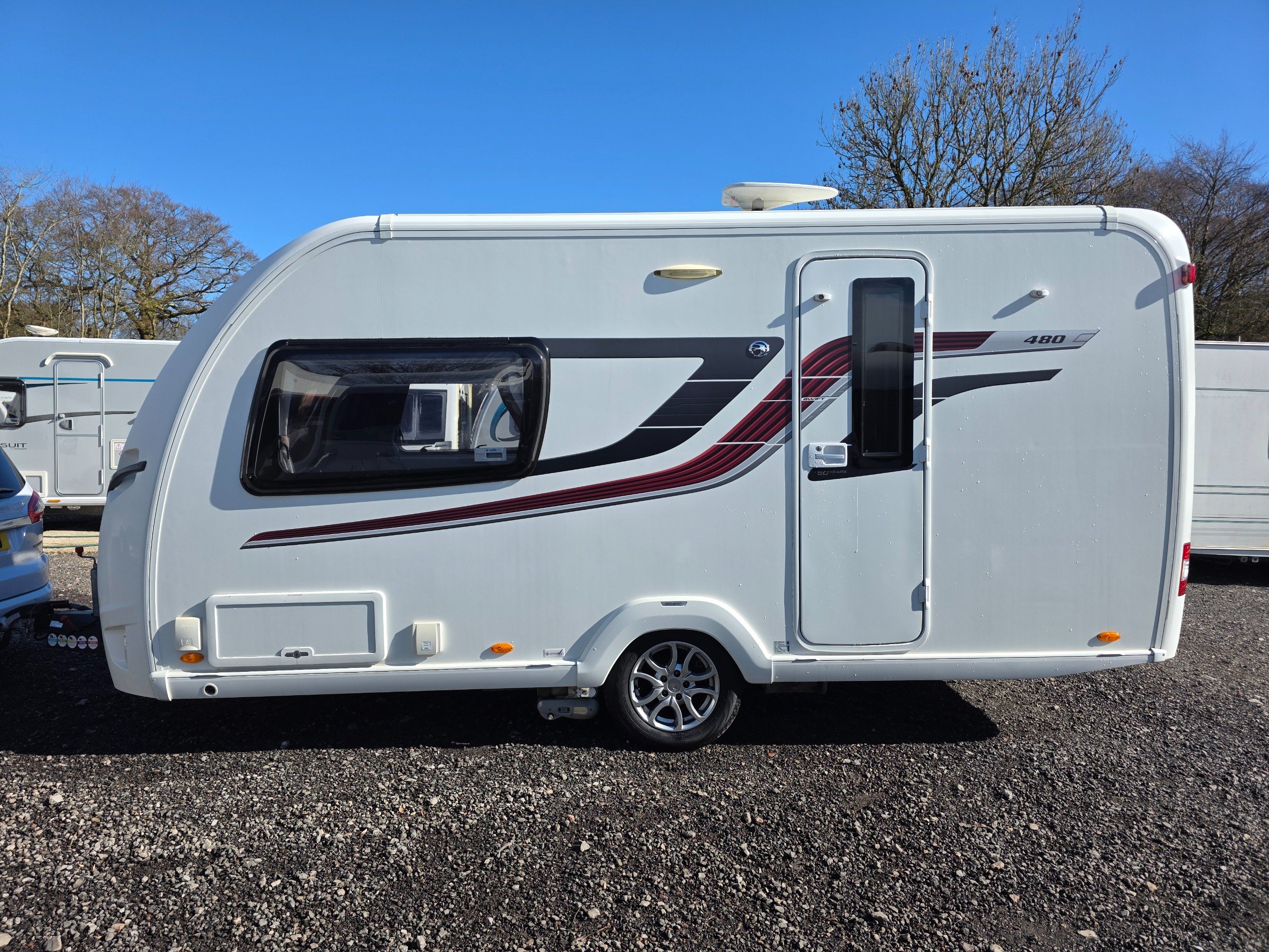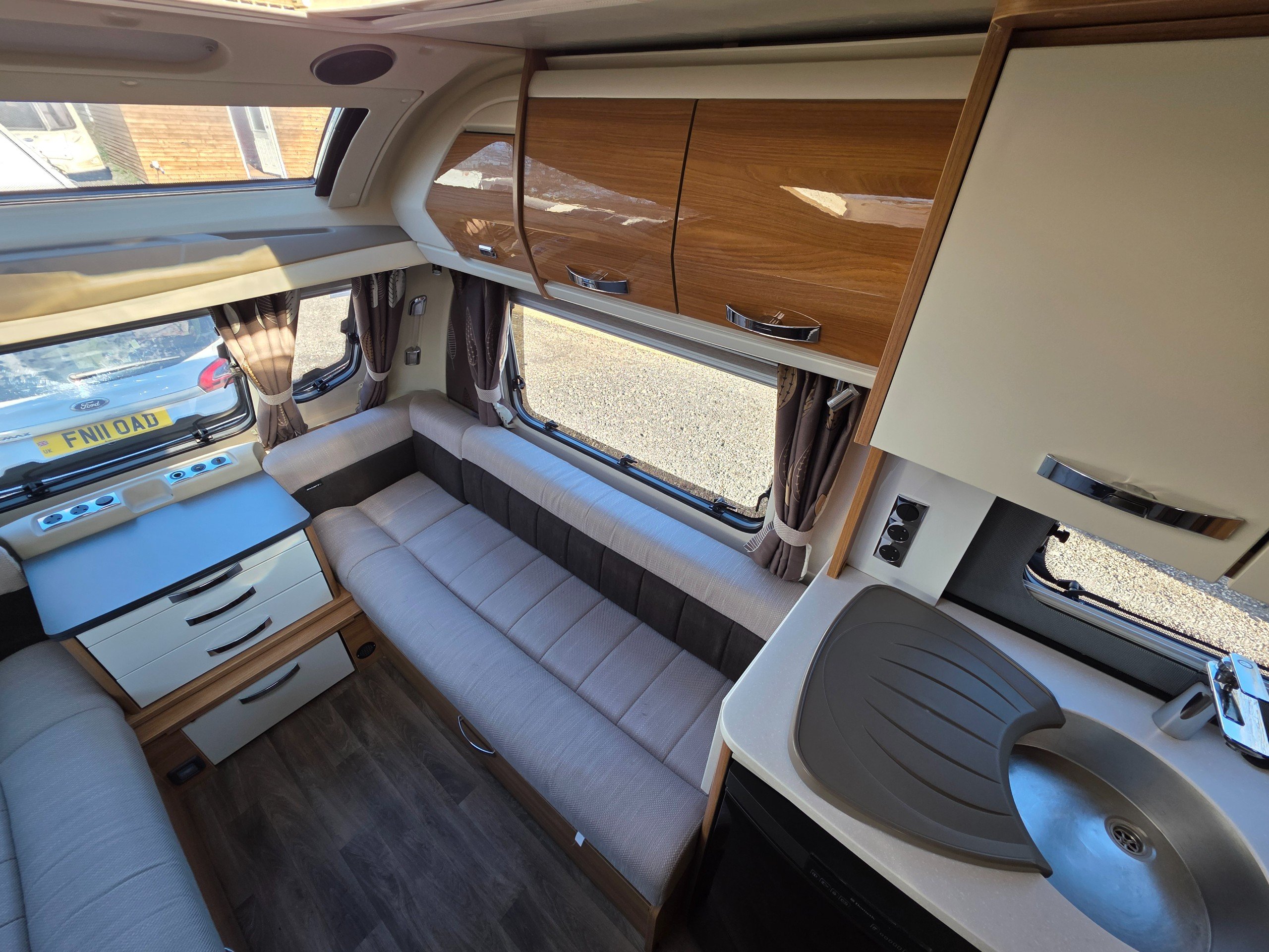 Swift Elegance 480, 50th Anniversary Edition, 2 berth 2014 caravan, in stunning condition inside and out. This caravan is fully ready to take camping, it has lots of features and extras what you would expect from a high spec caravan such as this. It includes: hot and cold water, full central heating, full screens and blinds, full oven and grill, three-way fridge/freezer, 240–12 V electricity, HEKI rooflight, Alko Antisway towbar and much more.This caravan comes with a full